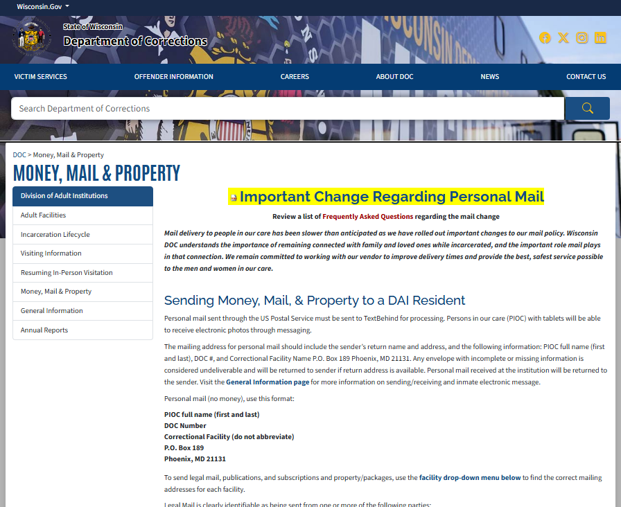 - https://doc.wi.gov/Pages/OffenderInformation/AdultInstitutions/MoneyMailProperty.aspx