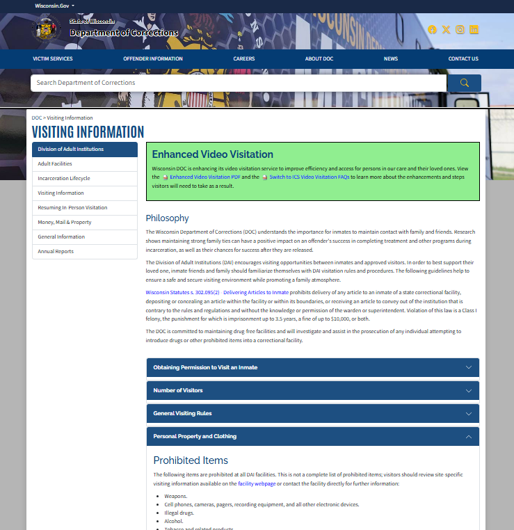 Wisconsin law strictly regulates visitation to prevent contraband and maintain safety. Wisconsin Statutes. 302.095(2) prohibits delivering unauthorized items to inmates, including drugs, weapons, or other prohibited articles. Violating this statute is classified as a Class I felony, carrying penalties of up to 3.5 years in prison, a fine of up to $10,000, or both. Visitors must understand that compliance with these rules protects them and the institution. Additionally, the DOC enforces a zero-tolerance policy for drugs and other illegal items. Staff regularly monitor visiting areas and inspect belongings to ensure safety. Visitors are expected to follow all procedures, including adhering to personal property restrictions, dress codes, and behavior standards.